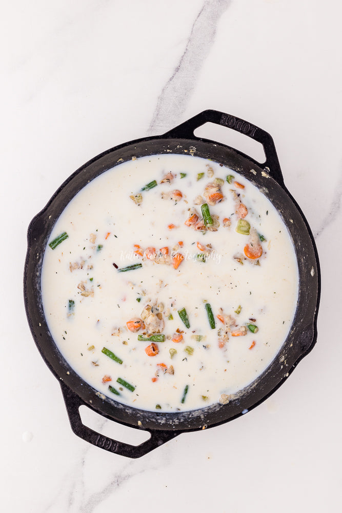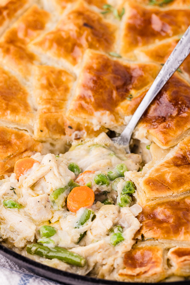 This easy, from-scratch recipe for Chicken Pot Pie is quick, delicious, and doesn't rely on canned soup! The entire dish comes together in under an hour, making it a perfect weeknight meal. Use up leftover chicken, grab a rotisserie chicken (or turkey, if you're working with post-Thanksgiving leftovers), and top it all off with a golden, flaky puff pastry crust.